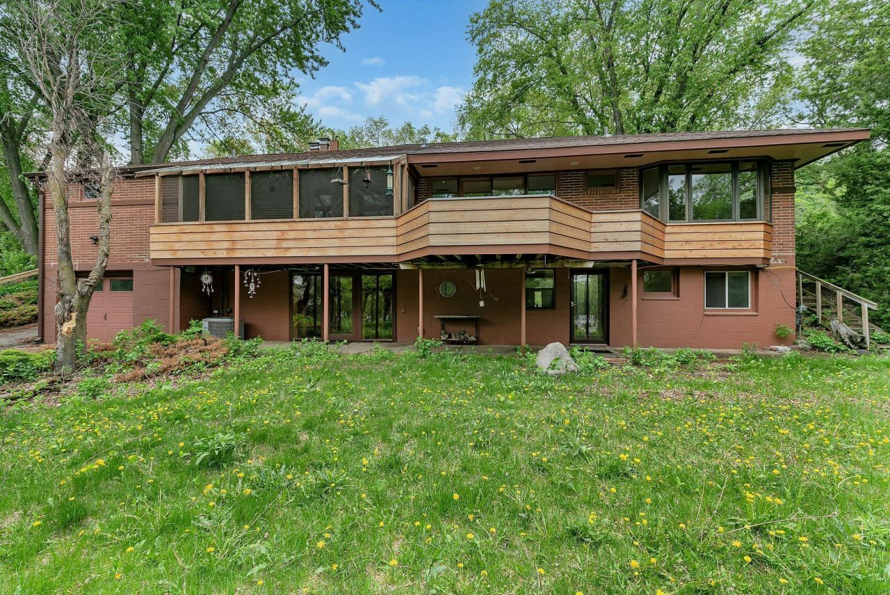 Welcome to this beautiful 1950's home with a Frank Lloyd Wright-Inspired Design on the Mississippi River. This architectural gem is truly one-of-a-kind?and unlike anything else on the market. With 5 bedrooms, 4 bathrooms, and jaw-dropping views of the Mississippi River, this home offers a rare opportunity to own a piece of living art. Step inside to discover soaring floor-to-ceiling windows that frame the river, built-in seating by a cozy wood-burning fireplace, and a kitchen outfitted with granite countertops, a gas stove, and unique storage solutions. The main floor also features a stunning entryway, main level laundry, and a living space that invites relaxation. Upstairs, you'll find two bedrooms full of character and architectural detail. The walk-out lower level boasts three additional bedrooms, two bathrooms, and a full Mother-In-Law suite with a private entrance, kitchen, and living area. The primary suite downstairs features its own fireplace and custom built-ins you won't see anywhere else. Outside, the backyard is centered around a magnificent, centuries-old oak tree?offering shade, beauty, and a timeless presence that anchors the natural surroundings. Enjoy panoramic views from the expansive deck, unwind in the screened-in porch, or simply soak in the peace and privacy of the riverfront setting. The home includes a one-car garage and a second tuck-under garage in the back. If you appreciate extraordinary architecture, nature, and unbeatable riverfront living?this home is a must-see.