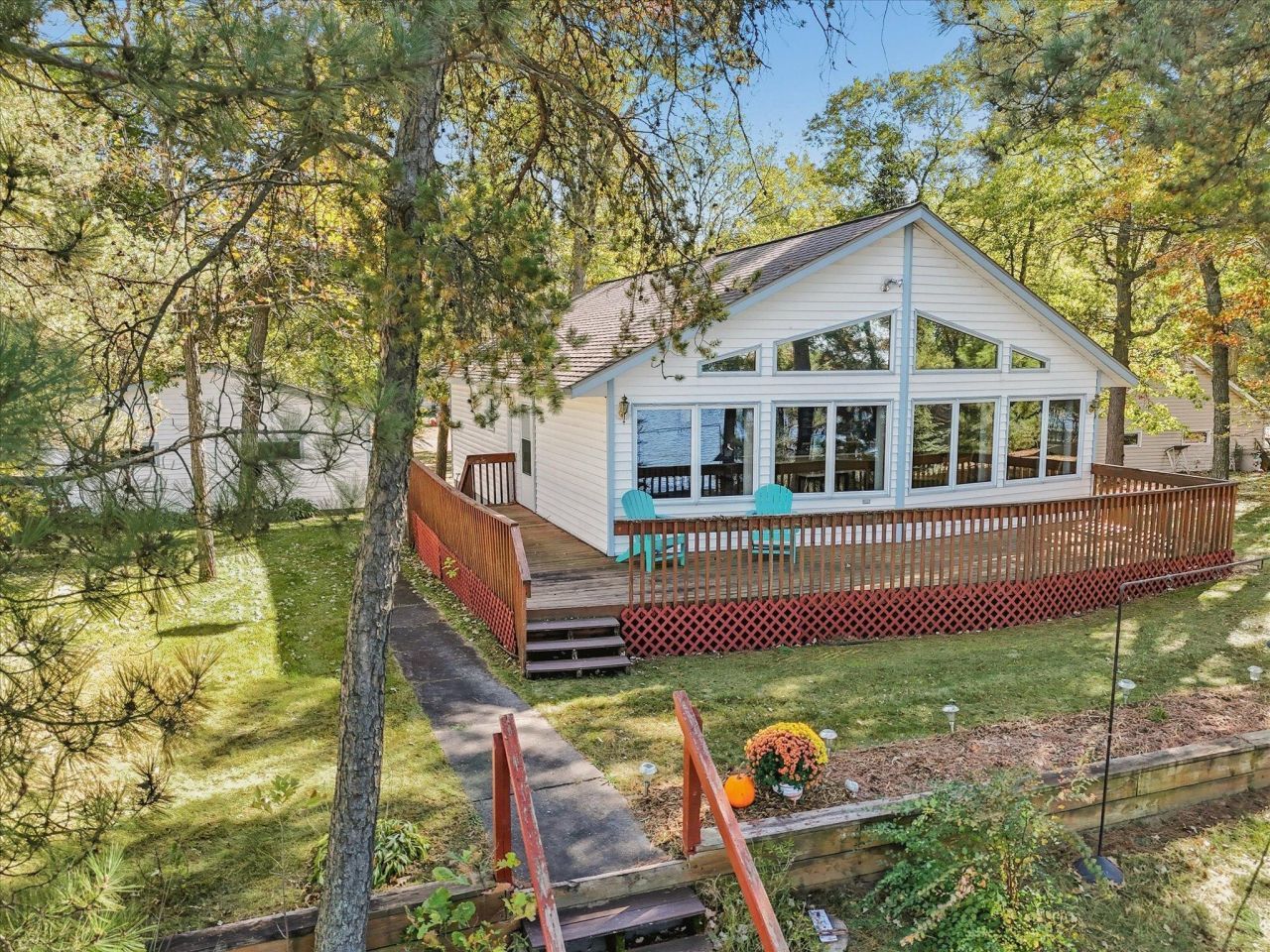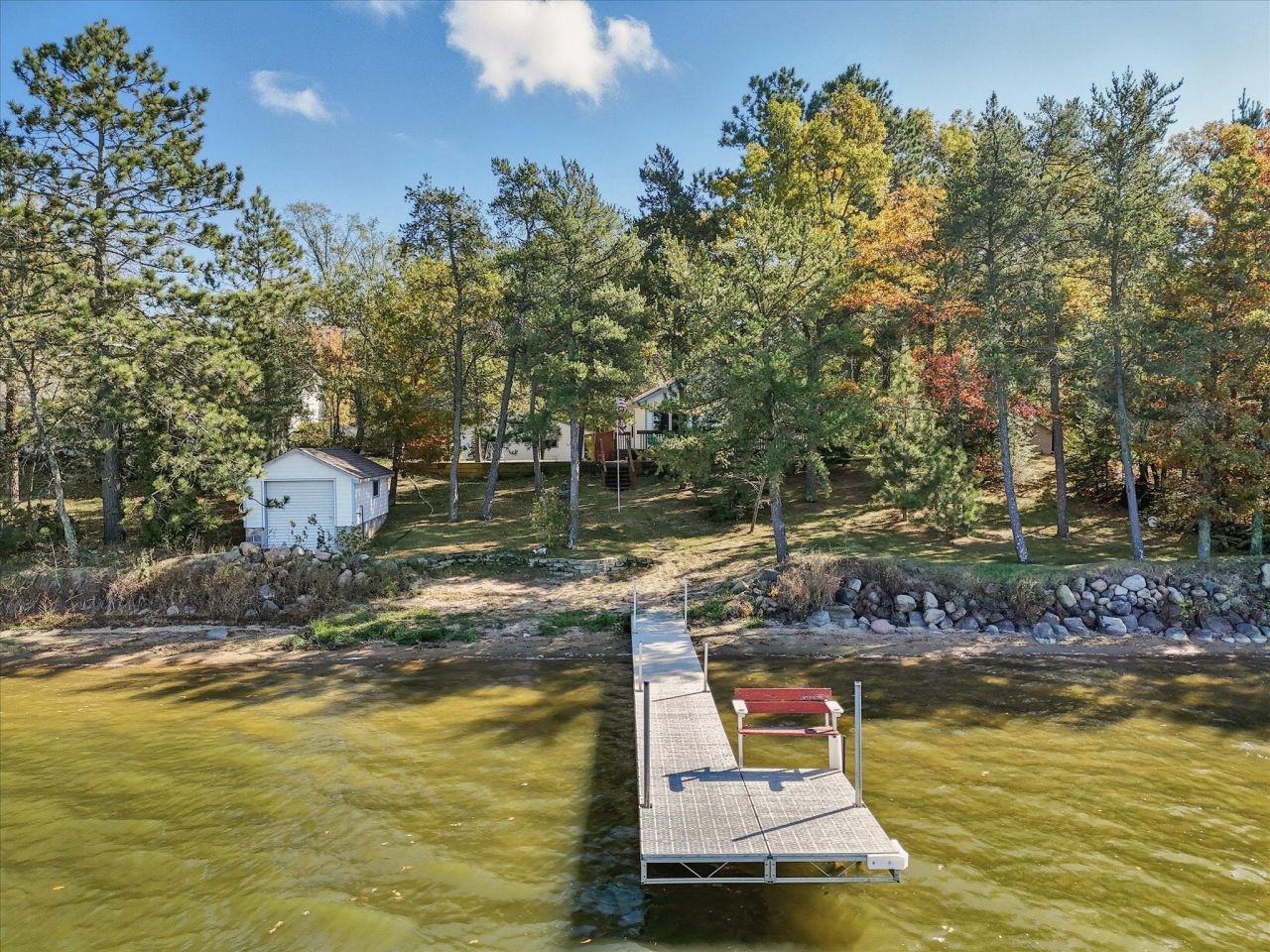Sandy swimmable beachfront right at your doorstep, ideal for relaxing summer days, water activities, and creating lasting memories. Easy access to the lake within just a few steps. This property is a rare opportunity to own a peaceful lakeside retreat with all the charm of Minnesota lake living. The full width lakeside deck is ideal for coffee, cocktails and sunsets. From the window filled prow front home, the lake views are exquisite. This rambler style year-around home boasts a sun filled open floor plan perfect for entertaining family and friends, four bedrooms, three baths, large lake facing main living area and a large functional kitchen with center island. A spacious 26x30 detached garage, 12x14 shed and 10x16 boat house, all with concrete floors and roll up doors. Thoughtfully situated on a beautiful treed 1/2 acre lot. Dock is included, let the fun begin!