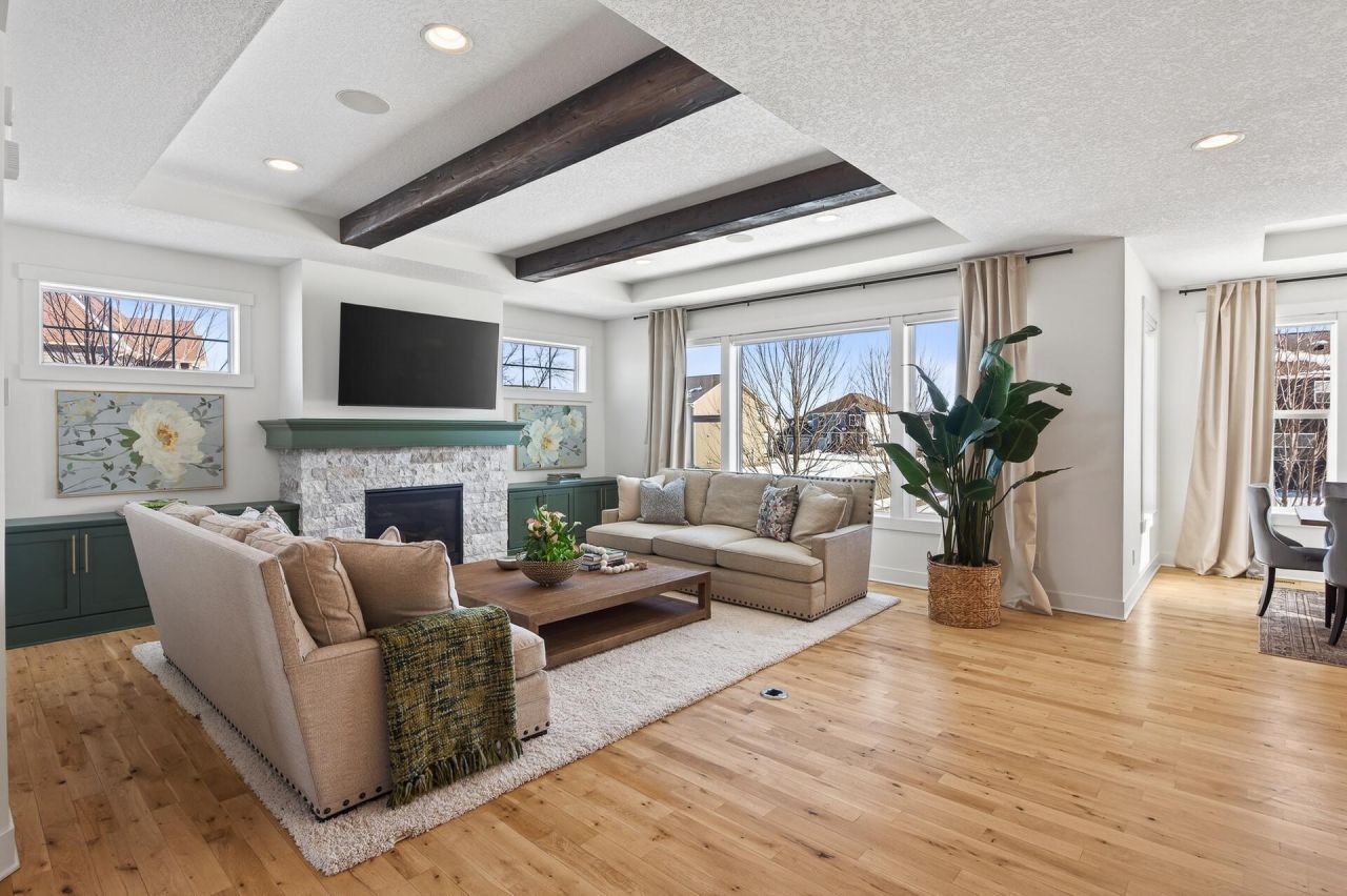 Elevated design meets effortless luxury! This custom-built Norton masterpiece in Serenity on the Greenway redefines refined living in Plymouth?within the award-winning Wayzata Public Schools district. Perfectly positioned on a beautifully landscaped .30-acre corner lot, this professionally managed neighborhood offers exclusive access to a shared pool and clubhouse, enhancing an already exceptional lifestyle. With over 5,000 finished square feet, five bedrooms, and five baths, the open-concept layout blends architectural detail with everyday comfort. It feels like new construction?only better?because every thoughtful upgrade and custom finish is already complete. Soaring ceilings with wood beams, abundant natural light, and gorgeous design elements immediately make a statement when you enter the home. The main level makes a stunning impression with white oak flooring and a gas fireplace with stone surround & cabinets that anchors the living room. The designer kitchen is both beautiful and a dream to cook in, featuring painted ceiling-height cabinetry, modern hardware, tile backsplash, quartz countertops, stainless steel appliances with vent hood, center island with breakfast bar, and a walk-in pantry. A major highlight, the vaulted four-season porch offers a paneled ceiling, fireplace, TV, ceiling fan, and LVP flooring, with a no-maintenance grill deck just beyond?creating seamless indoor-outdoor living. Upstairs, the spacious primary suite features a tray ceiling, custom bookshelves, a walk-in closet with custom organizers, and a spa-inspired bath with double bowl vanity and cabinet tower, soaking tub, and fully tiled shower. The fully finished lower level is built for fun & entertainment with a media room, game room, full wet bar with island seating, wine room, surround sound, fifth bedroom, and ¾ bath. Additional highlights include a main-level office, mudroom with built-in bench and lockers, laundry room with sink and folding counter, custom window treatments, multiple walk-in closets, oversized water heater, air-to-air exchanger, water softener, and a three-car insulated, fully finished garage with concrete driveway. With a rare blend of elevated style, thoughtfully designed layout, and premier location - this is the one that truly checks every box. Welcome home!