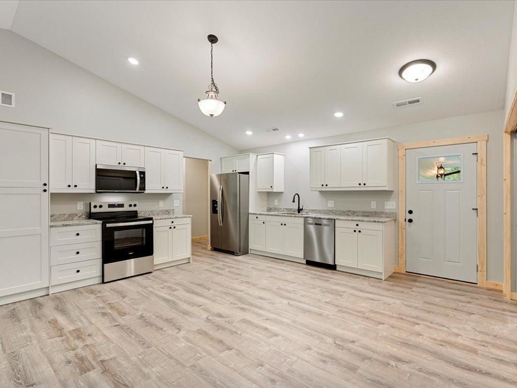 Check out this modern new home built by K Ecklund Construction. This comfortable 3 bedroom, 2 bath home has a bright , white exterior complimented with black and stone accents along with a paved driveway. Situated on a half-acre wooded lot that's already been seeded and landscaped walkway with nothing left to do. Inside you'll find a bright, inviting open floor plan with vaulted ceilings, white cabinets and doors, granite counter tops, stainless steel appliances, gas stove, tile showers and central air. The owner's suite has a private bathroom with a custom tile shower and large walk in closet. Step out to the backyard and unwind on the concrete patio and open backyard with plenty of room for entertaining. Let's not forget the heated, finished garage with floor drain and windows for natural light. Located in a great neighborhood, minutes from the freeway, golf courses, restaurants, lakes and everything the Brainerd Lakes has to offer. Two great homes to choose from, pick your favorite one first...